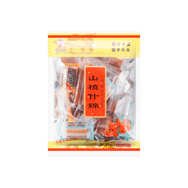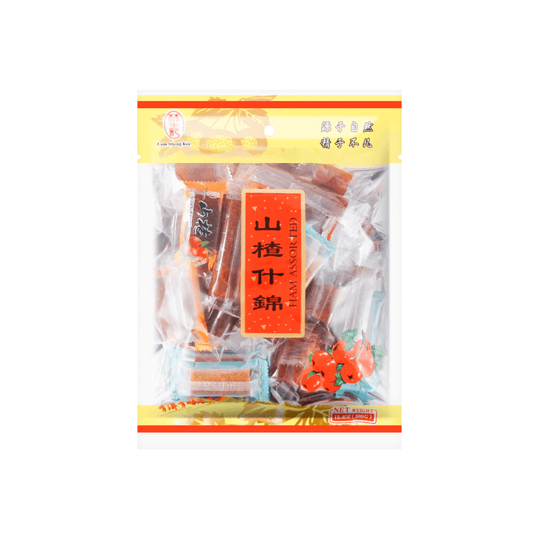 Is a mix of traditional Chinese candies, primarily featuring the sweet and tangy flavor of hawthorn fruit. The assorted bags contain a variety of hawthorn-based treats, which can include flakes, rolls, and jellies.
